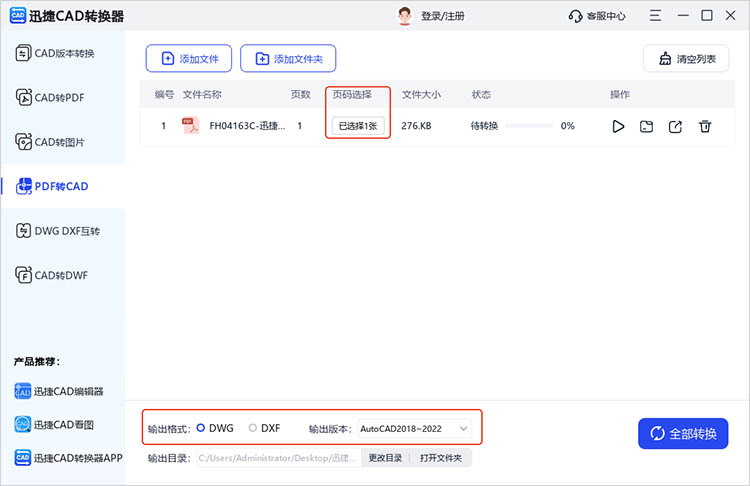 易于上手:用户只需上传PDF文件,选择目标格式为CAD,然后点击转换按钮即可。