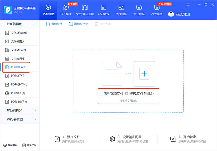 ①启动软件后,在【PDF转换】一栏中找到【PDF转CAD】功能。